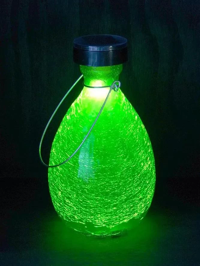 Solar Crackle Lanterns are perfect for adding elegant, soft light to your outdoor living decor. Made of colorful hand-blown glass, using a layered glassmaking technique that gives the glass a crackled surface and interior etching to produce a glowing beach-glass effect. At the top of each glass vase, there is a bottleneck on which a solar cap sits. This solar panel contains an internal battery to power the LED light. The battery gets charged as the solar panel is exposed to direct sunlight, and a light sensor switches on the LED at dusk. The light shining through colored glass, creates a beautiful glow, adding a magical ambiance to your patio, pathway, or garden. Each glass lantern also features an aluminum handle which can be used to hang the lantern from a shepherd’s hook, wall bracket, from an arbor, or even a tree branch. A single solar vase is lovely on an outdoor patio table or use several to line a pathway or to border a garden.