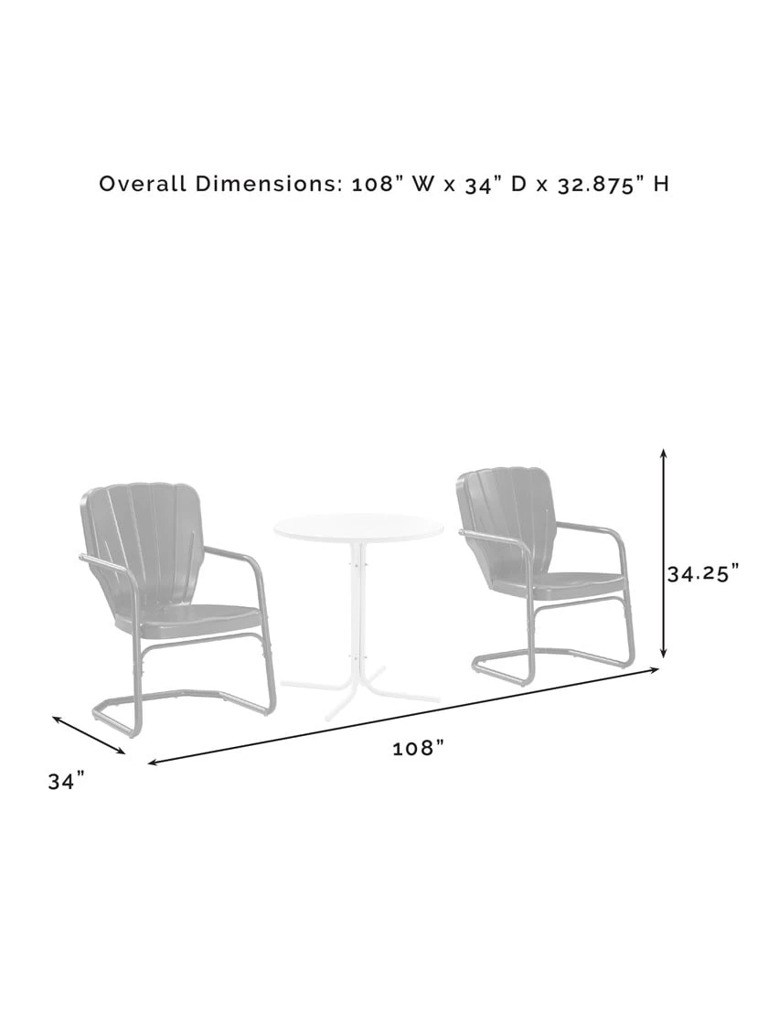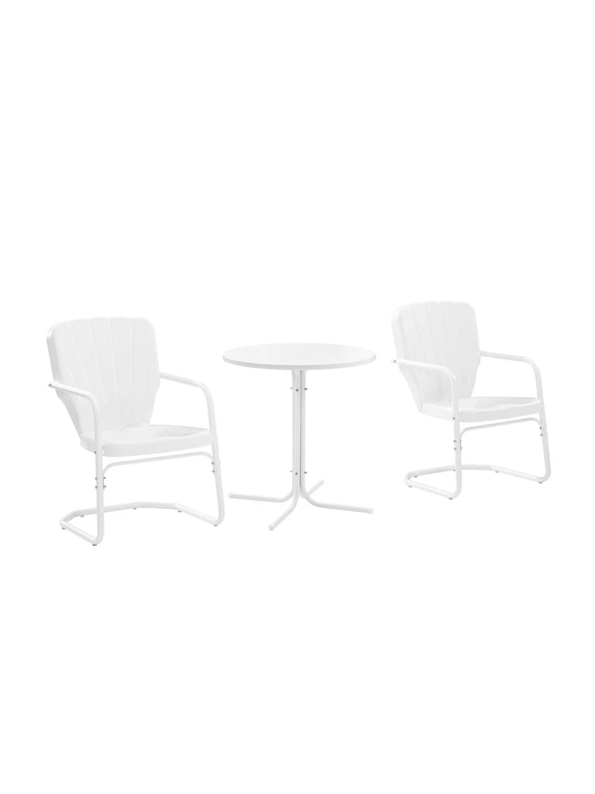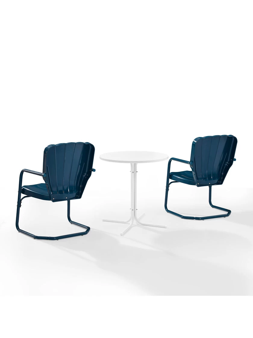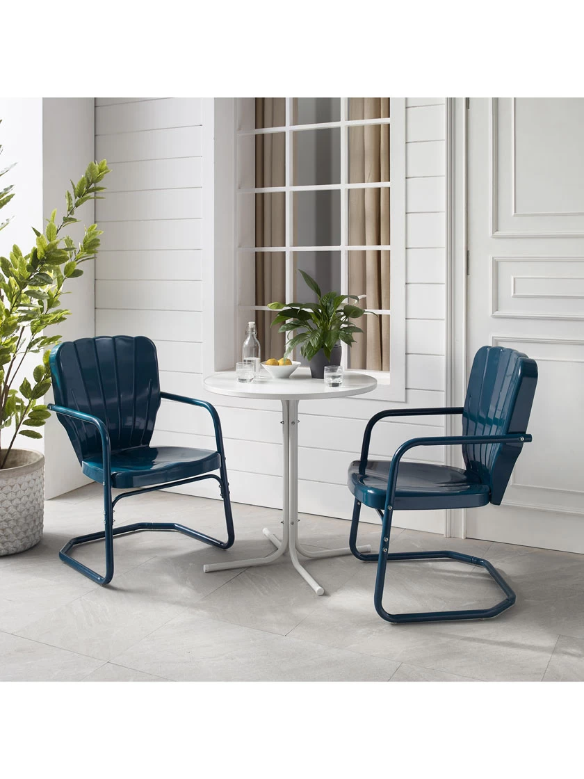 Inspired by the designs of yesteryear, the Ridgeland 3pc Bistro Set brings class and charm to your outdoor space. Two vintage-style chairs in vibrant colors surround a simple metal bistro table for a fun and functional outdoor lounging experience. Each chair features a clamshell back with decorative grooves, plus a cantilever base that provides just enough flex for lounging in comfort. The table’s sturdy pedestal base is comprised of four metal legs and easily tucks between the chairs, making the Ridgeland 3pc Bistro Set ideal for a small balcony or patio.