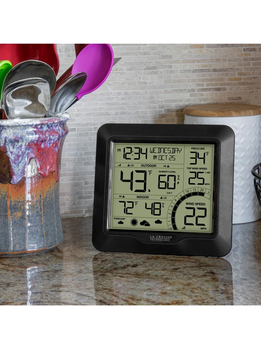 This wireless weather station will provide you accurate, backyard weather monitoring from the convenience inside your home. Includes easy-to-install instructions, mounting bracket and hardware. Wireless wind/thermo-hygro sensor transmits from a 330 ft range (open air) to your indoor console so you know what the weather’s doing without having to turn on a radio or TV. With so many features, this home weather center will definitely be a conversation piece. Indoor console displays full weather forecast icons with tendency, temperature, humidity, calendar, wind speed (top/current), and “feels like” temperature. Adjustable settings for HIGH & LOW alerts for temperature, humidity, and wind speed. Also features Frost & Storm Warnings. Outdoor multi-sensor combines wind, temperature, and humidity. Both indoor station and outdoor sensor are battery operated, not included.