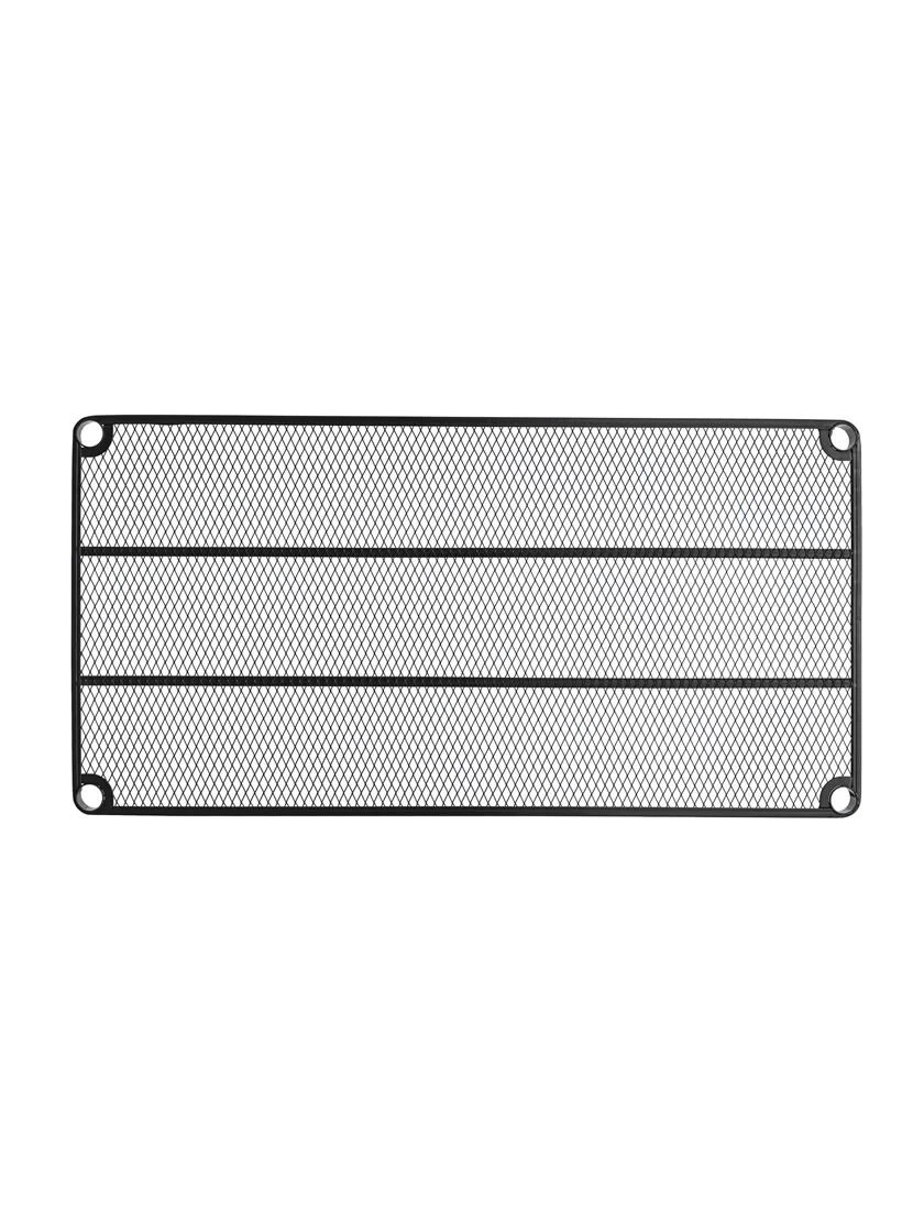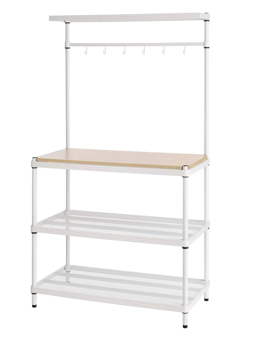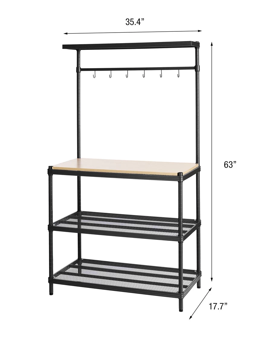 Traditional wire shelves can cause a headache as items can fall through the wide gaps on the shelves. Our brilliantly engineered mesh shelving units use a larger gauge of expanded metal mesh for style, strength and functionality. Each shelf has a weight limit of 440 pounds to safely hold everything from small knick knacks to large, heavy bins. The utility unit includes 4 adjustable shelves, a hook rack with 6 hooks, and a removable wood top work surface. Use in your prep area, the garage or garden shed to organize tools and potting supplies.