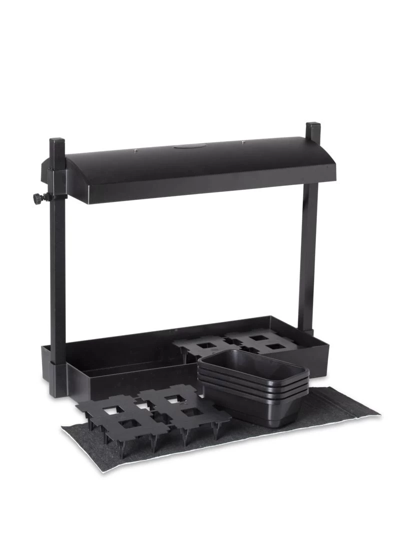Just 21-3/4″ long by 7-3/4″ wide, this light stand fits right on your kitchen countertop so you can have a fresh harvest at your fingertips. Grow fresh herbs to save a fortune versus store-bought, or grow spicy mixed greens to liven up bland supermarket salads. This complete self-watering system includes a reservoir and capillary mat that provides plants with water when they need it, keeping them healthy and reducing watering chores. It also includes four growing trays for direct seeding; you can also place your own herb pots right on the capillary mat for fuss-free watering. Also ideal for starting seeds for your outdoor garden or displaying African violets and other blooming houseplants.
