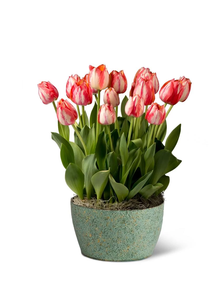 Celebrate your love with this simple yet stunning bulb garden. 18 beautiful ‘Spryng Break’ tulips displayed in a 10.5″ reusable metal cachepot, burst into bloom with petals of rich cream lined with luscious pink-red flames. With weeks of blooms to keep your sweetheart thinking of you, these bulbs will begin their lovely show in about three weeks.